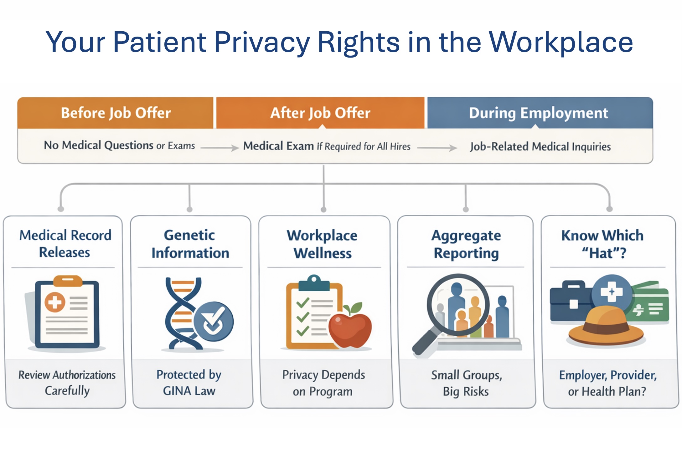 Your personal health information can affect hiring, firing, promotions, and workplace opportunities—so U.S. law limits what employers can ask for, how they can use it, and how it must be handled when they receive it. The rules depend on when the information is requested (before an offer, after an offer, or during employment) and why it's requested (job fitness, leave, accommodations, insurance, or wellness programs).