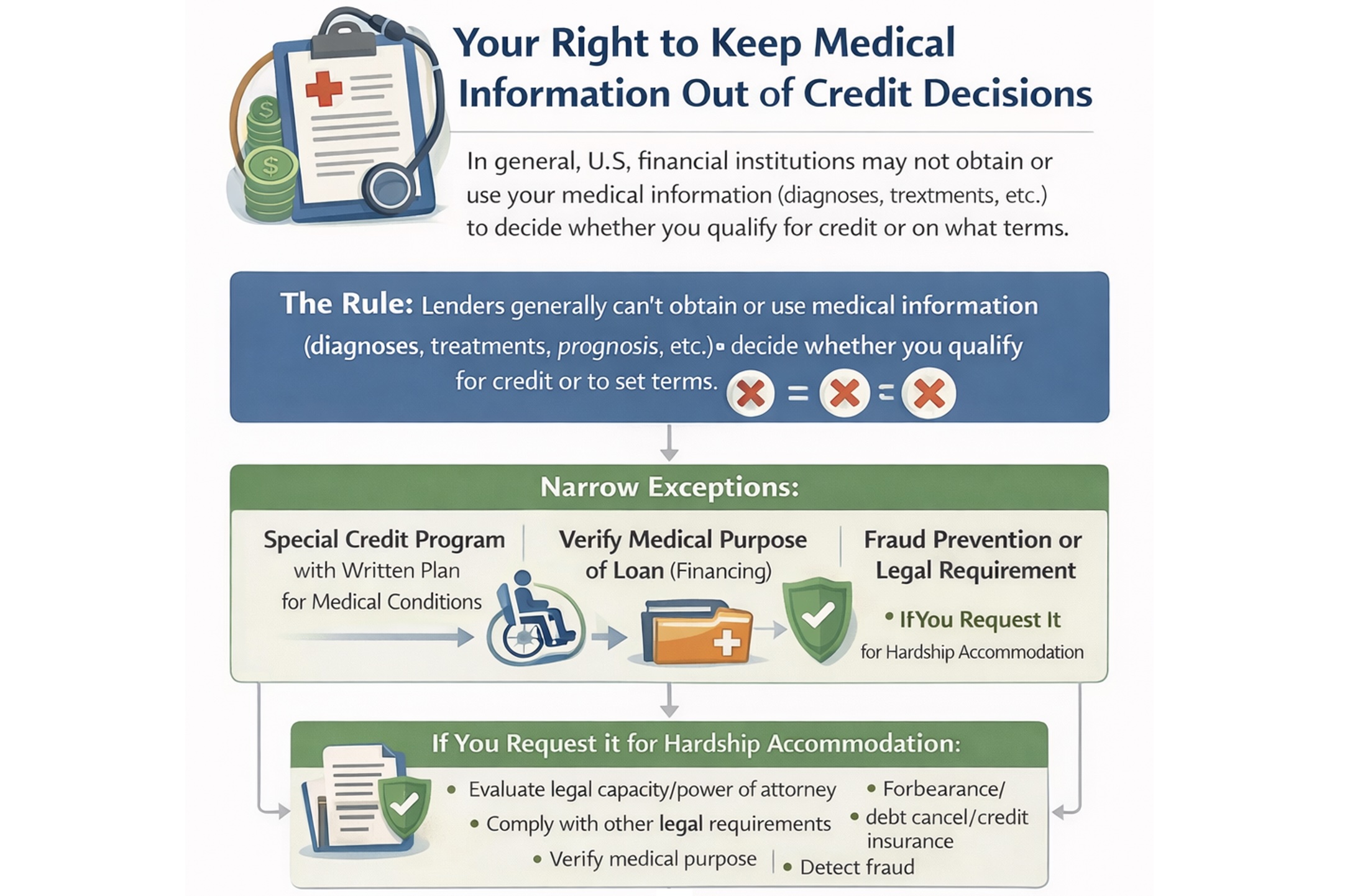 Medical information can feel intensely personal—and people often worry it could be used to judge their financial reliability. U.S. law generally tries to keep your diagnoses, treatments, and prognosis out of lending decisions, while still allowing limited use of medical information in a few specific situations (like verifying medical-purpose financing or honoring a hardship accommodation you request). The sections below explain what lenders usually cannot do, the narrow exceptions, and practical steps you can take if medical information shows up in a credit decision.