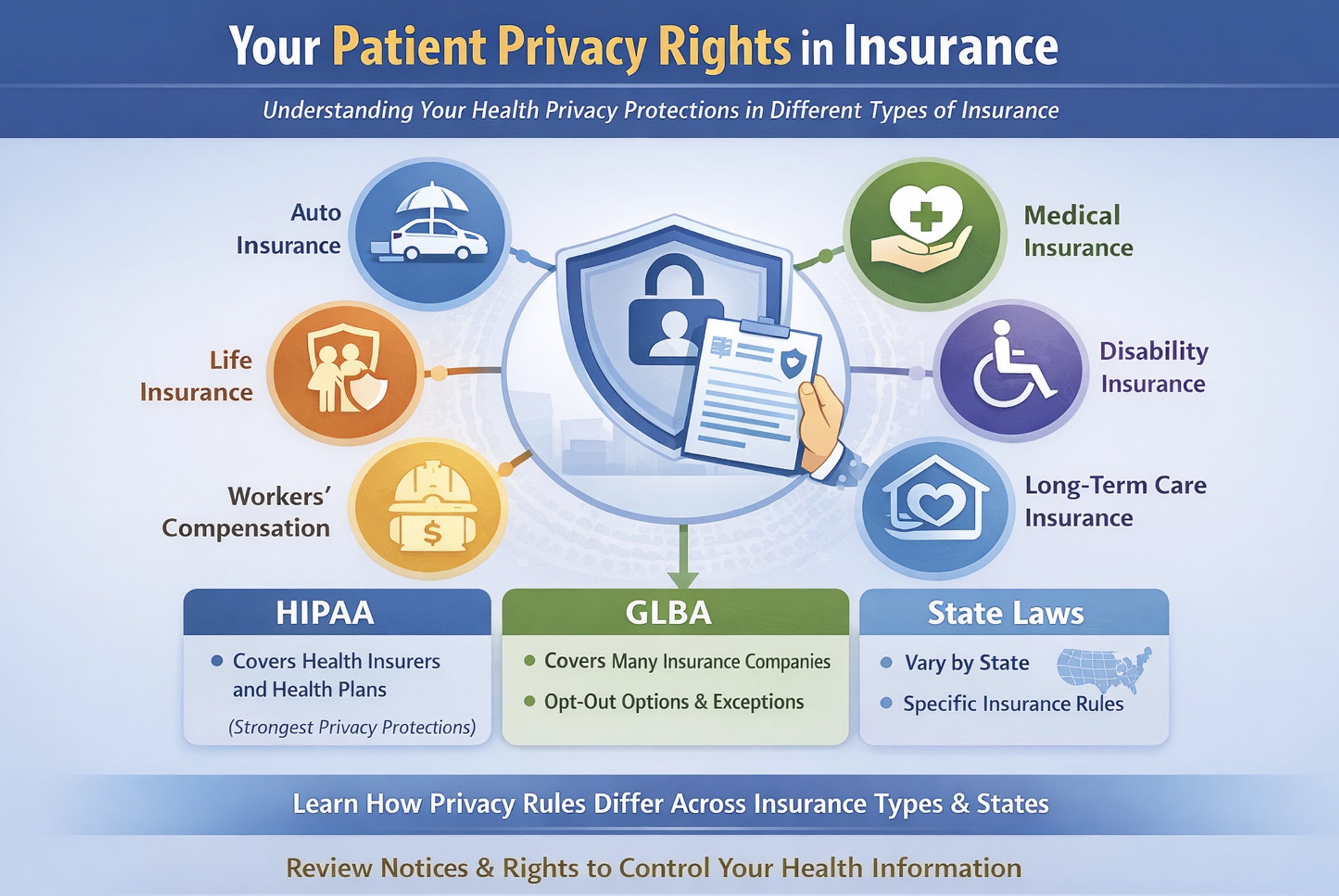 Your health privacy protections vary widely depending on the type of insurance involved, the specific insurance product, and your state. You can learn about your rights in specific types of insurance--medical, life, disability, long-term care, workers' compensation, and auto insurance. The content below provides an overview.)